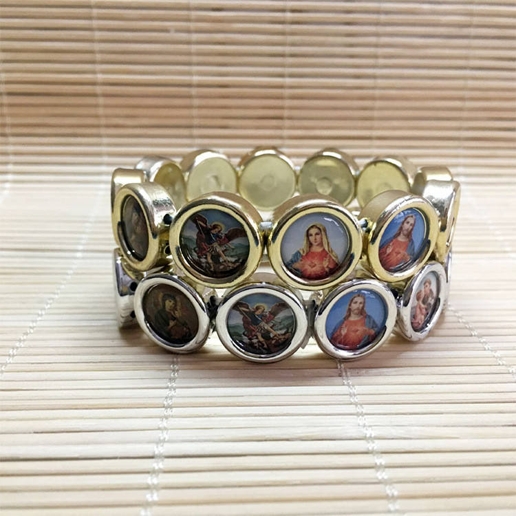 Komi Handmade Rosary Bracelet Elasticated Metal Bracelet Round Rose Alloy Beads Catholic Saints Images Prayer Bracelets R-036