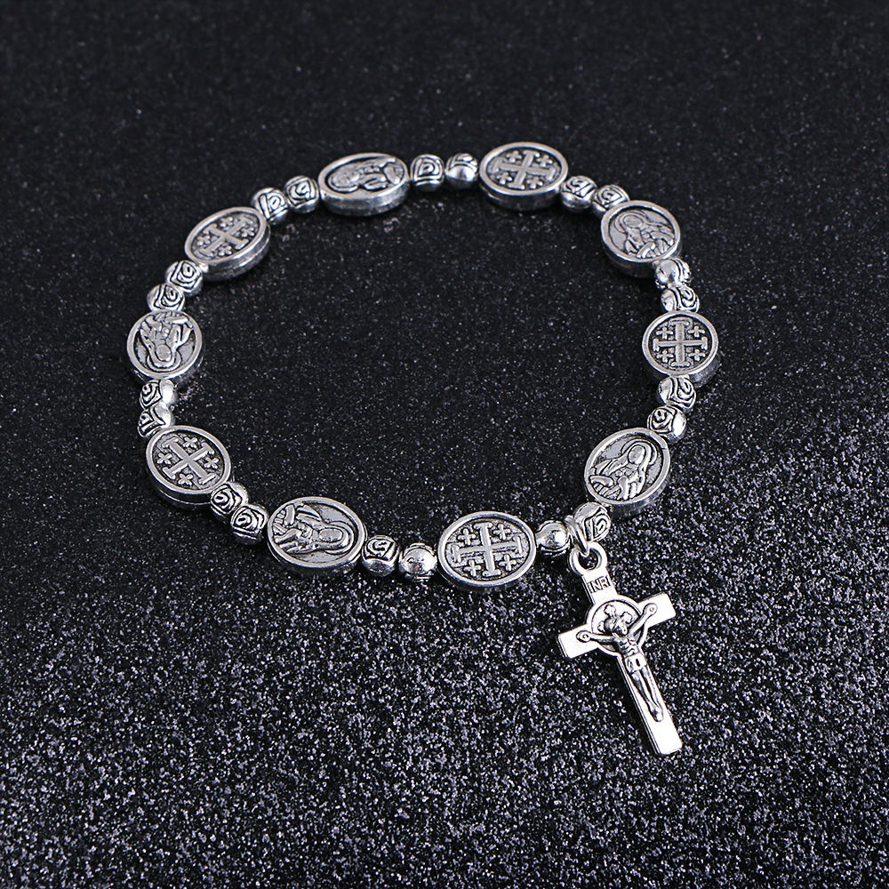 Komi Handmade Rosary Bracelet Elasticated Metal Bracelet Round Rose Alloy Beads Catholic Saints Images Prayer Bracelets